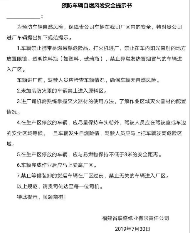 福建山鷹紙業基地 預防車輛自燃風險安全提示書