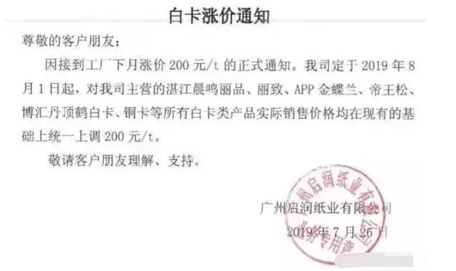 廣州啟潤紙業:因接到工廠下月漲價200元/t的正式通知,定于2019年8月1日起,對我司主營的湛江晨鳴、麗致、APP金蝶蘭、帝王松、博匯丹頂鶴白卡、銅卡等所有白卡類產品實際銷售價格均在現有的基礎上統一上調200元/噸。