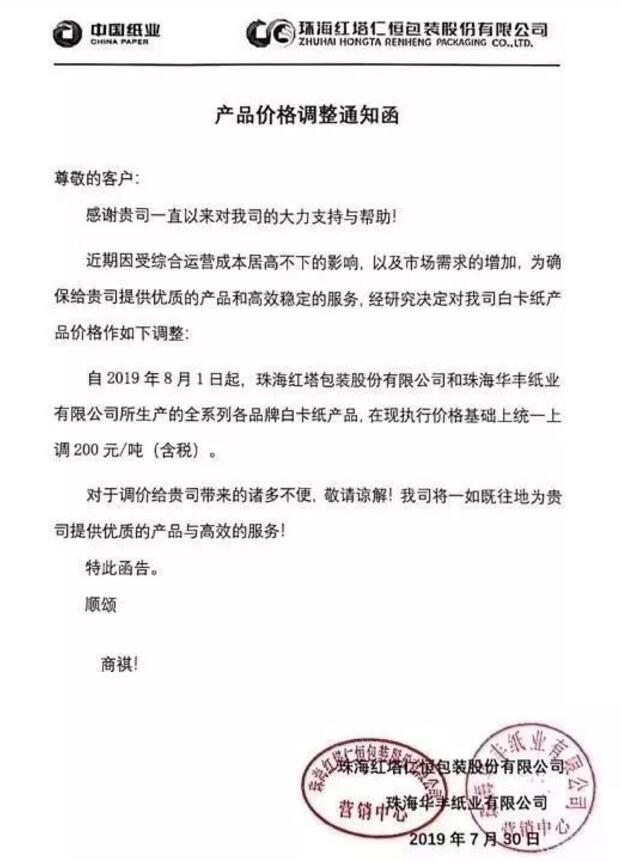 紅塔仁恒:自2019年8月1日起,珠海紅塔包裝股份有限公司和珠海華豐紙業有限公司所生產的全系列品牌白卡紙產品,在現執行價格基礎上統一上調200元/噸(含稅)。