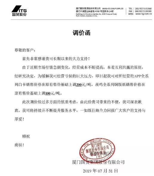 廈門建發:自2019年8月1日起,對我司經營的APP系類白卡(寧波、金桂白卡)及晨鳴白卡,在原有價格基礎上上調200元/噸。原有未完成訂單、新單、工廠直發訂單及其他未盡事宜請與經辦人聯系。