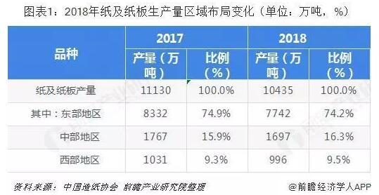 中國造紙行業(yè)整體集中度較低,個別紙種市場相對成熟。中國造紙行業(yè)受第二階段的環(huán)保政策收緊的影響,2010年-2015年間造紙行業(yè)共計淘汰落后產(chǎn)能近4000萬噸,行業(yè)去產(chǎn)能效果初步顯現(xiàn),紙及紙板的產(chǎn)銷量增長速度都有所放緩,行業(yè)供需進(jìn)入弱平衡時期。 區(qū)域集中度與往年差異不大 根據(jù)中國造紙協(xié)會調(diào)查資料,2018年我國東部地區(qū)11個省(區(qū)、市),紙及紙板產(chǎn)量占全國紙及紙板產(chǎn)量比例為74.2%;中部地區(qū)8個省(區(qū))比例占16.3%;西部地區(qū)12個。▍^(qū)、市)比例占9.5%。