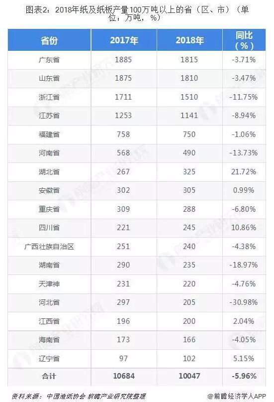 而在省份格局上,廣東、山東以及浙江為主要產(chǎn)區(qū)。2018年廣東、山東、浙江、江蘇、福建、河南、湖北、安徽、重慶、四川、廣西、湖南、天津、河北、江西、海南和遼寧17個省(區(qū)、市)紙及紙板產(chǎn)量超過100萬噸,產(chǎn)量合計10047萬噸,占全國紙及紙板總產(chǎn)量的96.28%。