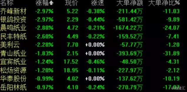 1、全線飄綠的紙業股:玖龍下跌逾3%,理文一個月內跌幅逾20% 8月13日,港A兩地紙業股幾乎全線受壓。A股市場中,20只紙業概念股中僅有4只概念股上漲,其余個股則紛紛下跌。其中,齊峰新材和銀鴿投資下跌近3%,領跌整個紙業板塊;晨鳴紙業則下跌2.88%,民豐特紙和美利云下跌逾2%。 此外,當日港股市場的紙業股也“全軍覆沒”,其中陽光紙業和玖龍紙業下跌逾3%,晨鳴紙業下跌2.2%,理文造紙下跌1.47%。并且,理文造紙一個月內跌幅逾20%。