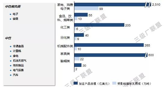 以上就是此次對美進口商品涉及到紙包裝相關產品的清單?梢钥吹剑还苁菑U紙、紙漿還是里面所標注的包裝用紙(牛皮紙、瓦楞原紙),都和三級廠上游原料供應相關。征稅對三級廠的需求端影響不大,其影響更多的只是給紙包裝原料漲價帶來一種可能性?紤]到連續下跌到冰點的原紙價格,這種可能甚至可以說是不痛不癢。 我們再看美國從8月15日、8月24日兩次對我出口美國產品加征的關稅對紙箱終端需求的影響。 中國進口美國最主要的是農產品,是以大豆為最大宗,其次就是航空航天產品、汽車、半導體,而在機械方面中國進口美國最多的是醫療機械。而在出口方面,出口到美國的產品中制造業最龐大,其中,電氣設備、消費電子產品、汽車、家具、紡織品、日用品等最為關鍵。而這些幾乎都涉及到紙箱包裝,可以說和三級廠利益息息相關。 小編手頭有一份分析中美進出口貿易結構的數據。通過這個數據,我們可以很直觀的看到美國5000多億美元加征關稅對箱板瓦楞紙相關行業的影響有多大。