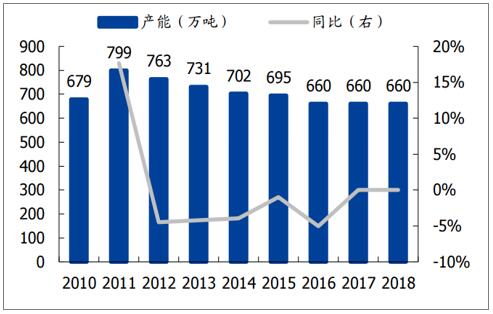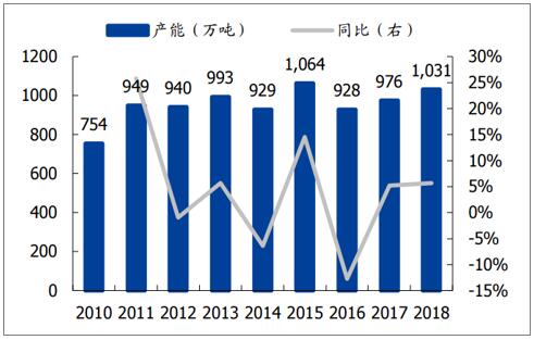 數據來源:公共資料整理 3.產能增長放緩,2019年無新增產能投放。 銅版紙產能自2012年持續(xù)下降,2018年產能未增長。2018年晨鳴投放100萬噸雙膠紙產能,其他上市紙企無新增雙膠紙產能,2018年雙膠紙產能凈增55萬噸至1031萬噸。根據當前大型紙廠擴建計劃,2019年沒有新增雙膠銅版紙產能。 雙膠紙產能及同比增速