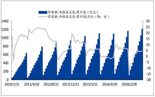 數據來源:公共資料整理 4.預計未來需求增長平穩(wěn),供求保持平衡狀態(tài)。 文化紙終端對應圖書印刷、教材出版、辦公用紙等需求,需求較為穩(wěn)定。雜志類社零額維持較為穩(wěn)定的低個位數增長,2015~2018年CAGR為3.1%,2018年增速雖較2017年有所放緩,但仍有4.3%的增長。2018年宏觀經濟承壓,雙膠/銅版紙表觀需求量增速下滑至2.6%/1.2%,但仍維持正增長,預計未來仍維持個位數增長,因此預計未來文化紙供求維持平衡。 2018年書報雜志類社零額同比增長4.3%