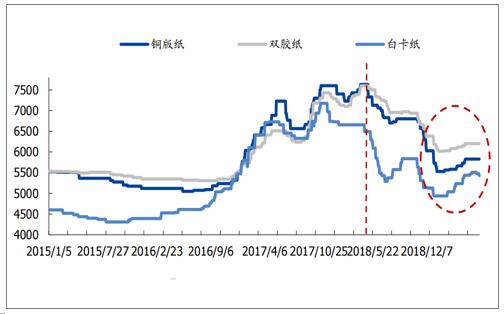 數據來源:公共資料整理 5.從短期的需求波動來看,文化紙庫存已經降至低位,補庫需求將成為紙價上漲重要驅動力。 經歷2017H2~2018H1造紙行業(yè)過熱周期,中間環(huán)節(jié)庫存處于高位。2018年4月白卡紙價格戰(zhàn)開始,白卡紙首先開始降價,木漿系銅板雙膠紙價格聯(lián)動性下跌,并且在高庫存壓力下,行業(yè)被動進入去庫周期,白卡/雙膠/銅版紙價格從2018年4月6660/7483/7500元/噸跌至2019年2月4943/6017/5533元/噸。 6.中間環(huán)節(jié)庫存降至低位,表現為淡季不淡,19H1紙價開始回升并企穩(wěn)。 銅板、雙膠和白卡紙從2019年2月開始發(fā)布漲價函,截至2019年5月共發(fā)布5輪漲價函,落實4輪,白卡/雙膠/銅版紙分別提價500/200/300元/噸。6月進入文化紙需求淡季,并且在木漿價格下降背景下,三大紙種價格保持穩(wěn)定并未下滑。表明下游庫存較低,淡季仍存在補庫需求,因此淡季不淡,8月旺季來臨,預計木漿系成品紙價格仍有上漲空間。補庫需求支撐下,預計木漿系成品紙利潤向350元/噸左右的合理水平回歸。 木漿系成品紙價格走勢
