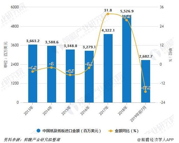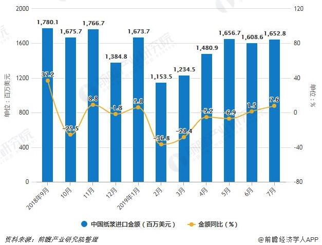 2018-2019年7月中國紙漿進口量、金額統(tǒng)計及增長情況