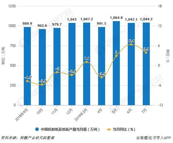 2018-2019年7月中國機制紙及紙板產(chǎn)量統(tǒng)計及增長情況