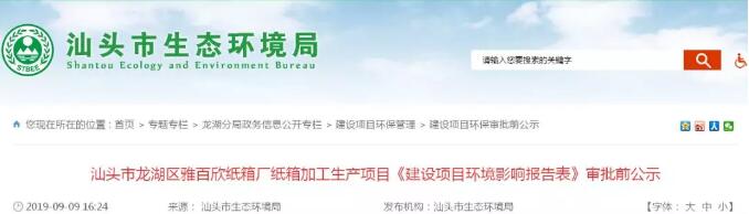 項(xiàng)目名稱(chēng):紙箱加工生產(chǎn)項(xiàng)目; 建設(shè)單位:廣東省汕頭市龍湖區(qū)雅百欣紙箱廠; 建設(shè)地點(diǎn):廣東省汕頭市龍湖區(qū)外砂鎮(zhèn)華埠村官洋片區(qū)56號(hào); 項(xiàng)目概況:該項(xiàng)目總投資100萬(wàn)元,其中環(huán)保投資20萬(wàn)元。項(xiàng)目占地面積1080平方米,建筑面積2280平方米,主要從事紙箱加工,年加工紙箱100萬(wàn)個(gè)。主要設(shè)備印刷開(kāi)槽機(jī)、高速釘箱機(jī)、水墨印刷機(jī)、痕切線(xiàn)機(jī)等。廠區(qū)不設(shè)員工食堂和宿舍。 (▲來(lái)源:汕頭市生態(tài)環(huán)境局) 2、 安徽一新建紙箱包裝項(xiàng)目已完成驗(yàn)收
