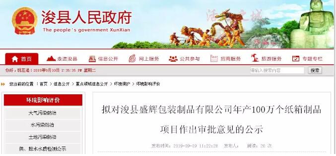 項(xiàng)目名稱(chēng):河南省遂平縣雙龍紙箱包裝有限公司技改項(xiàng)目; 投資情況:總投資30萬(wàn)元,其中環(huán)保投資11萬(wàn)元; 項(xiàng)目性質(zhì):該項(xiàng)目屬于技改。 項(xiàng)目概況:占地面積10000㎡,項(xiàng)目主要建設(shè)內(nèi)容利用現(xiàn)有廠房對(duì)現(xiàn)有的生產(chǎn)線(xiàn)進(jìn)行技術(shù)改造,新增水印和絲網(wǎng)印工藝。建設(shè)地點(diǎn)位于遂平縣鐵西開(kāi)發(fā)區(qū)(107國(guó)道西側(cè))。該項(xiàng)目審批事項(xiàng)在縣政府網(wǎng)站公示期滿(mǎn),公示期間無(wú)異議。根據(jù)遂平縣發(fā)展改革委員會(huì)出具的企業(yè)投資項(xiàng)目備案證明(項(xiàng)目代碼:2019-411728-23-03-034683),縣國(guó)土局出具的土地證及專(zhuān)家技術(shù)審查意見(jiàn)等相關(guān)文件可知,該項(xiàng)目符合國(guó)家產(chǎn)業(yè)政策及用地要求,原則批準(zhǔn)國(guó)環(huán)宏博(北京)節(jié)能環(huán)保科技有限責(zé)任公司編制的《河南省遂平縣雙龍紙箱包裝有限公司技改項(xiàng)目環(huán)境影響報(bào)告表》,建設(shè)單位要落實(shí)《報(bào)告表》中提出的各項(xiàng)環(huán)保污染治理設(shè)施和環(huán)保治理資金,嚴(yán)格執(zhí)行建設(shè)項(xiàng)目環(huán)境管理規(guī)定。 (▲來(lái)源:遂平縣人民政府) 4、河南一年產(chǎn)30萬(wàn)個(gè)紙箱生產(chǎn)新項(xiàng)目