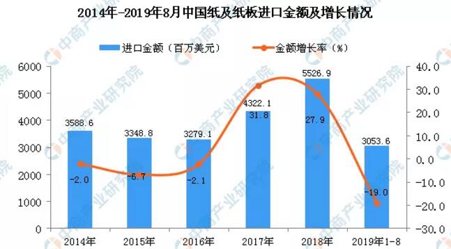 數(shù)據(jù)來源:中商產(chǎn)業(yè)研究院數(shù)據(jù)庫 從金額方面來看,2019年1-8月中國紙及紙板進(jìn)口金額為3053.6百萬美元,同比下降19%。