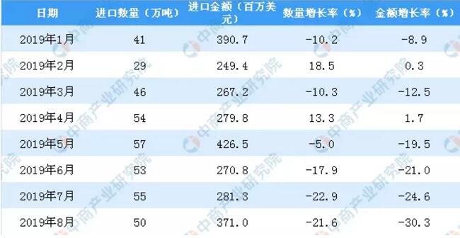 數(shù)據(jù)來源:中商產(chǎn)業(yè)研究院數(shù)據(jù)庫 2019年1-8月中國紙及紙板進(jìn)口數(shù)量及金額增長率情況