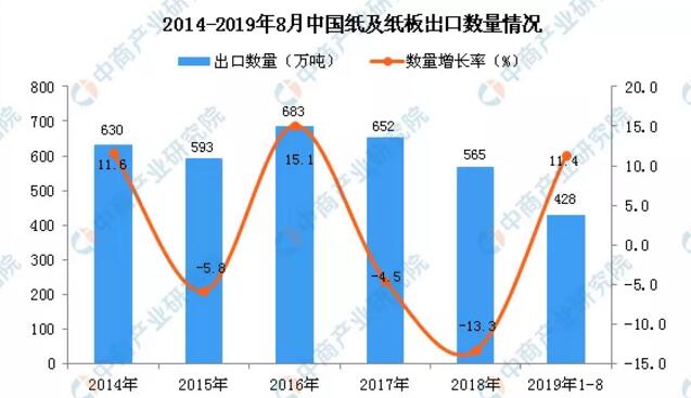 數(shù)據(jù)來源:中商產(chǎn)業(yè)研究院數(shù)據(jù)庫 2019年1-8月中國紙及紙板出口量為428萬噸同比增長11.4% 據(jù)中商產(chǎn)業(yè)研究院數(shù)據(jù)庫顯示,2019年1-2季度中國紙及紙板出口量有所增長,2019年1-8月中國紙及紙板出口量為428萬噸,同比增長11.4%。