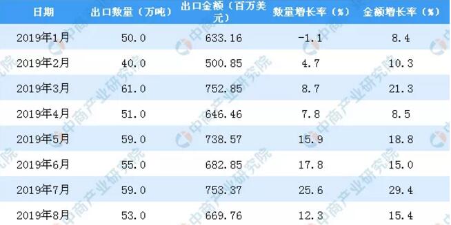 數(shù)據(jù)來源:中商產(chǎn)業(yè)研究院數(shù)據(jù)庫 從金額方面來看,2019年1-8月中國紙及紙板出口金額為5370.79百萬美元,同比增長15.9%。