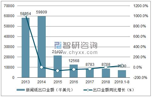 2013-2019年8月中國新聞紙出口數(shù)量及出口金額統(tǒng)計表