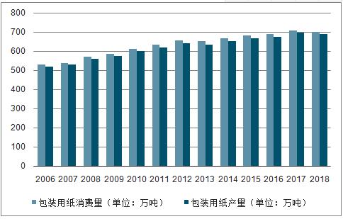 數據來源:公共資料整理 2018年包裝用紙生產量690萬噸,較上年增長-0.72%;消費量701萬噸,較上年增長-0.85%。2009~2018年生產量年均增長率2.05%,消費量年均增長率1.99%。 2006-2018年中國包裝用紙消費量和產量數據走勢圖(單位:萬噸)