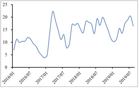 數據來源:公共資料整理 行業景氣度下行,預計短期包裝紙價格仍將承壓,長期紙價趨于穩定。2018年受到國廢價格高位運行和下游需求減弱的影響,瓦楞紙和箱板紙價格高位回落,行業景氣度下行。2019年上半年造紙行業依舊處于下行周期,同時受中美貿易戰影響,需求持續偏弱,紙價上行承壓。從19年初至今,箱板瓦楞紙庫存不斷提高,今年7月庫存天數達到20.42天,接近17年歷史庫存高位22.22天。庫存高企疊加下游需求疲弱,預計19年包裝紙價格仍將承壓。從長期來看,受制于供給端增量有限,且未來包裝紙需求增長空間大,預計長期紙價將趨于穩定。 箱板紙國內市場價格(元/噸)