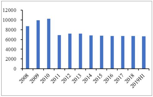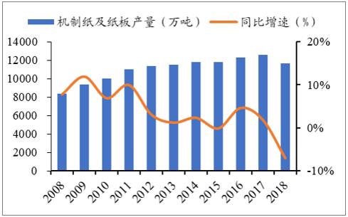 數據來源:公共資料整理 環保政策趨嚴,去產能持續推進,供給端增速放緩。國家通過提高企業排放標準和環保要求,來淘汰造紙行業內的落后產能,實現國家供給側改革去產能的目標。“十二五”期間,全國共淘汰落后產能3433萬噸,“十三五”期間,國家計劃進一步淘汰800萬噸落后產能。在去產能的背景下,造紙行業供給逐漸放緩,2012-2018年全國紙及紙板產量從11257.70萬噸增長至11712.50萬噸,CAGR為0.48%,2018年產量同比下降7.03%,行業去產能效果明顯。 2008-2018年紙及紙板產量及增速