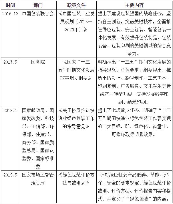 數據來源:公共資料整理 二、紙包裝行業發展前景 1.紙包裝綠色環保,政策助推行業發展。 近年來,政府出臺多項政策鼓勵發展綠色環保、可循環使用的包裝,推動包裝產業轉型發展,市場對包裝物環保性要求的日益提高。紙包裝作為綠色環保的包裝材料,具有易降解、再循環使用、節約成本等特點,符合我國節能減排和可持續發展的目標。受益于政府的政策支持與公眾環保意識的提升,未來紙包裝行業將迎來進一步的發展。 包裝行業政策