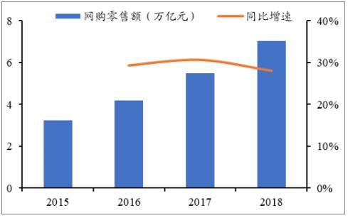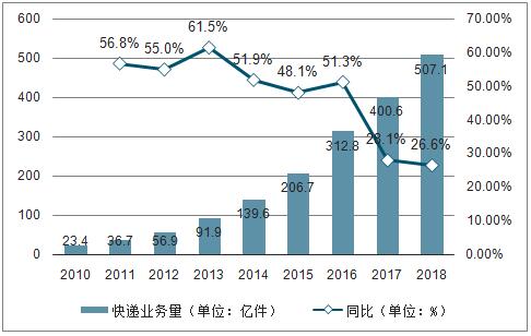 數據來源:公共資料整理 2.電商迅速發展成為包裝紙增長的動力之一 近20年來,中國經濟快速增長,紙包裝業務收入也快速增加。盡管近年來中國經濟增速出現下滑,但是6%以上的經濟增長速度在全球范圍內仍然屬于高速增長,經濟增長對包裝紙需求的拉動作用還在繼續。在經濟發展的大背景下,中國的電商快遞業務從無到有,尤其是2008年以來,快遞業務的收入規模和快遞數量都呈現出井噴式增長,即便近年來增速有所下滑,但是也還是維持在20%以上的超高增長速度,屬于行業從初期的野蠻式增長到逐漸成熟階段的自然過渡。電商業務的快速發展離不開與之相配的線下物流和快遞配送,受電子商務、快遞物流快速發展的拉動,中國的紙包裝業務收入在三種主流包裝形式(紙包裝、塑料包裝、金屬包裝)中一枝獨秀,也呈現出井噴式增長的態勢。 2018年,我國快遞服務企業業務量達到507.1億件,同比增長26.6%。快遞業務增量為106.5億件,快送業務量及増量均創歷史新高。我國日均快件處理量達到1.4億件,最高日處理量達到4.2億件,同比增長25.7%。2010-2018年,我國快遞業務量年均復合增長率達46.9%,是同期國內生產總值增速的6倍以上,增速居現代服務業前列,是我國新經濟的代表行業。我國快遞業務量超過美、日、歐發達經濟體之和,占全球快遞包裹市場份額的一半以上。我國快遞業務量規模連續五年穩居世第一,成為全球快遞包市場發展的動力源和穩定器。 2010-2018年快遞業務量變動情況(單位:億件,%)