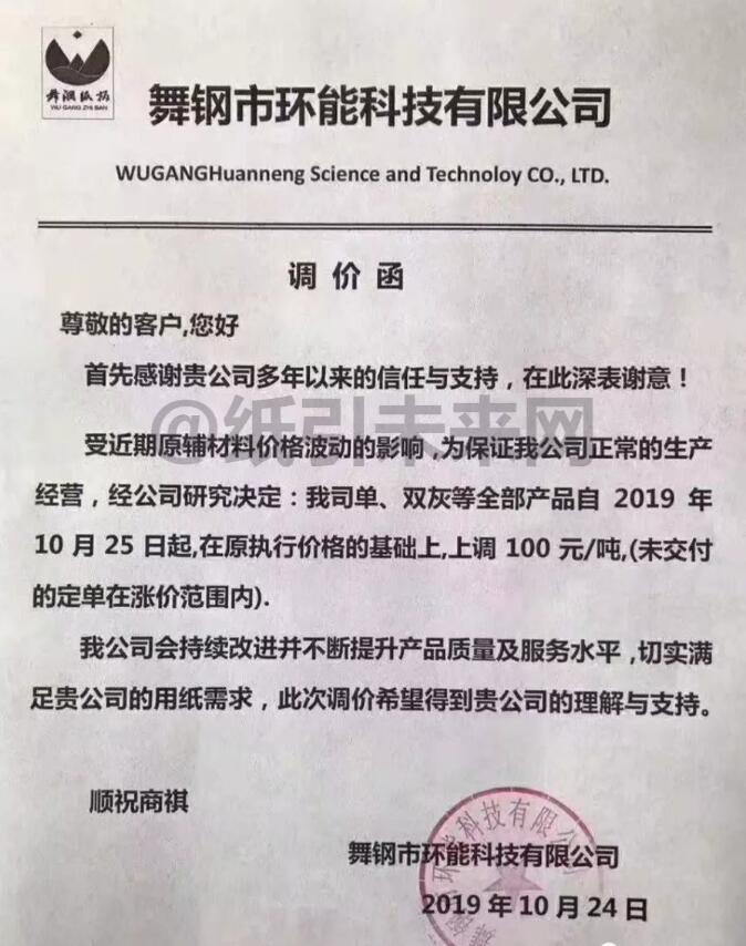 湖北長江匯豐紙業:因近期原材料上漲,特向廣大用戶作如下通知并敬請理解:從2019年11月1日起,我司單面涂布,白板紙在目前價格基礎上上調100元/噸。 江門星輝造紙有限公司:由于原材料及生產輔料近期持續上漲,從2019年10月30日起,提貨價格在目前價格的基礎上,上調RMB100元/噸。