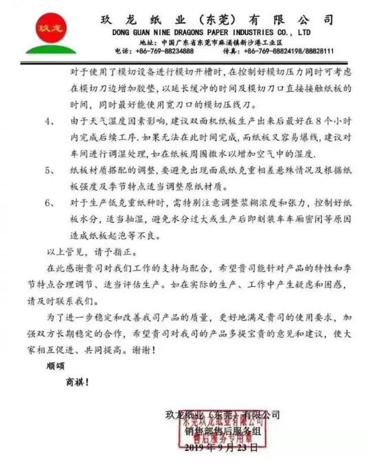 尊敬的用戶: 您好,感謝貴司一直以來對玖龍紙業的信任和大力支持! 時值初冬,風干物燥。根據紙板、紙箱行業多年來的生產經驗并結合原紙紙質在此環境下的特點,為適應這一季節性氣候變化,避免由于外界環境溫濕度的變化給紙板、紙箱及彩盒的生產造成不必要的麻煩和損失,希望貴司能根據自身的實際使用情況,特別是低克重紙種、再生紙種,綜合考慮紙質物理性能,在生產工藝及材質搭配方面做出合理調整。我們從紙質特性的角度出發,特給貴司溫馨提示如下: 每年干燥季節(約9-10月份)開始到第二年的3月份,紙板、紙箱極易出現爆線及紙板起泡現象,對于使用牛皮卡紙、瓦楞芯紙生產紙板、紙箱時請注意: 1、紙板制板時請注意根據原紙的水分變化對預熱缸溫度、包角大小以及熱板溫度及車速等進行合理調節,避免因原紙水分過分喪失而影響最終紙板成型的各項物理性能。同時依據所制紙板的材質及實際水分含量情況適當調整抽風時間。 2、對硬度高、水分含量低的紙板,壓線時尤為容易出現爆裂現象,請貴司生產時給予特別留意。如有必要,可參考以下方案來進行防范: 、俸侠碚{節壓線輪的準確性及壓線輪作用的深淺; ②依據壓線設備的實際情況,在壓線請先進行一道預壓。 如上述操作還不能滿足實際情況,可在紙板壓線部位進行預涂水處理后再進行壓線工序操作。 3、對于紙箱生產方面主要是在開槽壓線部位容易有爆裂現象產生,這時我們可根據實際情況來決定開槽位的深淺,一般可開深3-5mm,同時在開槽的寬度上可根據紙箱的尺寸形狀來調節,這樣可有效避免開槽位易出現爆裂現象。如是使用印刷、開槽一體設備生產時,建議控制開槽機的壓力同時,注意保持壓線送紙輪與開槽刀口在一直線上。而對于使用了模切設備進行模切開槽時,在控制好模切壓力同時可考慮在模切刀邊增加膠墊,以延長緩沖的時間及模切刀口直接接觸紙板的時間,同時最好能使用寬刀口的模切壓線刀。 4、由于天氣濕度因素影響,建議雙面機紙板生產出來后最好在8個小時內完成后續工序。如果無法在此時間完成,而紙板又容易爆線,建議對車間進行調濕處理,如在紙板周圍撒水以增加空氣中的濕度。 5、紙板材質搭配的調整,要避免出現面底紙克重相差懸殊情況及根據紙板強度及季節特點適當調整原紙材質。 6、對于生產低克重紙種時, 需特別注意調整漿糊濃度和張力,控制好紙板水分,適當抽濕,避免水分過大或生產后即刻裝車車廂密閉等原因造成紙板起泡等不良。 以上管見,請予指正。 在此感謝貴司對我們工作的支持與配合,希望貴司能針對產品的特性和季節特點合理調節、適當評估生產。如在實際的生產、工作中產生疑慮和困惑,請及時聯系我們。 為了進一步穩定和改善我司產品的質量,更好地滿足貴司的使用要求,加強雙方長期穩定的合作,希望貴司對我司的產品多提寶貴的意見和建議,使大家相互促進、共同提高。謝謝! 二、入秋紙板爆線高發期!"防爆"實用技巧,各位老板請收下! 此外,小編還為大家整理了技術專家團隊此前分享的一些“防爆”實用技巧,希望對大家有所幫助。 1、印刷機壓線爆線 一般情況下,低克重、低等級材質的紙板,在冬季爆線的幾率是非常大的。但是,現在很多紙箱廠使用的都是高等級的紙板,如果還出現爆線,那我們就要考慮一下紙箱壓線的問題了。 印刷的壓線分為預壓和正式壓線,預壓輪主要起到粉碎瓦楞的作用,把瓦楞壓潰后,使之更有利于紙箱壓線成型。壓線輪的正確調整及設備改進可以減少爆線的發生。 壓線的不同種類:
