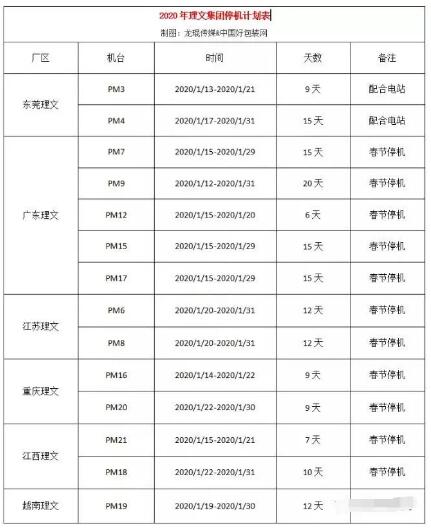 11月5日,理文造紙CEO李文斌簽發(fā)了2020年春節(jié)理文集團(tuán)停機(jī)計(jì)劃表:從2020年1月12日起到1月31日止,在春節(jié)前后,理文國(guó)內(nèi)外六大生產(chǎn)基地共有14臺(tái)紙機(jī)將錯(cuò)時(shí)停機(jī),停機(jī)時(shí)間在6-20天不等。