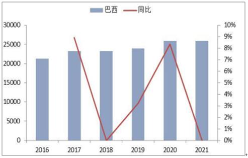 數據來源:公開資料整理 從趨勢上來看,2016年-2021年美國、日本、瑞典等主要生產大國產能基本穩定,而巴西則有明顯產能增加,到2021年的復合增長率為4%。 2016-2021年巴西產能及預測