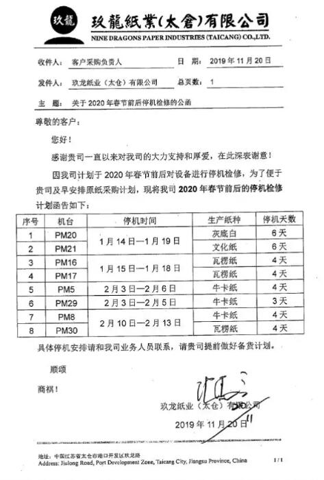 導語:這兩天,與漲價齊來的還有大型紙廠的2020春節停機函也接踵而至。繼理文造紙近日發布停機函后,東莞玖龍、太倉玖龍也拋出了春節停機通知。東莞玖龍將于2020年1月8日起13臺紙機停機6-23天,總時長196天。太倉玖龍將于1月14日起8臺紙機停機3-6天,總時長35天。在此提醒華南、華東的包裝印刷廠提前安排好生產計劃,以免造成不便! 1、東莞玖龍:1月8日起13臺紙機停機6-23天,總時長196天