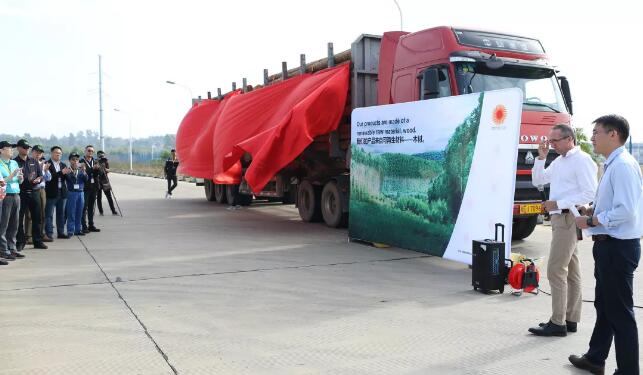 北海工廠總經(jīng)理朱偉言(左)向林業(yè)總經(jīng)理勃朗登贈送紀(jì)念牌 2019年11月13日,斯道拉恩索廣西林業(yè)向北海工廠交付第100萬方機(jī)械采伐木材原材料慶祝儀式在鐵山港舉行。斯道拉恩索重要的合資伙伴廣西林業(yè)集團(tuán)、北海林業(yè)投資有限公司的代表,及來自斯道拉恩索林業(yè)運營周邊鄉(xiāng)鎮(zhèn)政府代表們共同見證了這一重要時刻。