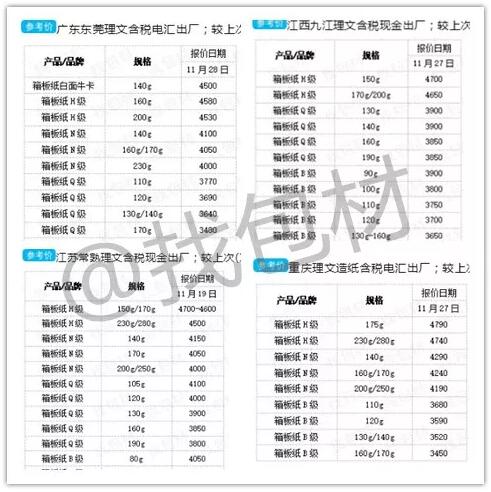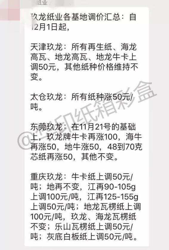 ▲圖片來源:找包材 2、12月1-3日,短短3天市場已經冒出41張漲價函 據不完全統計,12月1日-3日,廣東、山東、河北、浙江、江蘇、福建、湖北、四川、遼寧、山西、吉林、江西等12省已累計發出41張漲價函(含上文提及的玖龍、理文、山鷹基地的漲價),不得不說漲勢猛烈!有紙箱廠人士感慨:紙還是那個紙,可惜價已不是那個價!太真實了! 浙江新勝達控股集團:12月4日起,成品紙價格上調100元/噸。 浙江道勤紙業:12月4日起,成品紙價格上調50元/噸。 江門市明星紙業:12月4日起紗管紙漲價50元/噸。 中山市橫欄鎮永鳴紙類制品廠:12月2日起,上調坑紙價格。 山東世紀陽光紙業集團:12月2日起,紗管紙、瓦楞紙價格上調100元/噸。 山東豐源通達電力中科分公司:12月4日起,紗管紙價格上調100元/噸。 山東德派克紙業:12月3日起,所有紗管紙價格上調100元/噸。 德州泰鼎新材料:12月3日起,紗管紙價格上調50元/噸。 匯勝集團:12月3日起,紗管紙價格上調100元/噸。 山東榮華紙業:12月3日起白板紙現金出廠價上漲100元/噸。12月6日起灰板紙現金出廠價上調100元/噸。 秦皇島金茂源紙業:12月2日起瓦楞紙及紗管紙價格上調50元/噸。 秦皇島沅泰紙業:12月1日起各種克重高強瓦楞紙價格上調50元/噸。 沙河市久發紙業:12月3日起,紗管紙價格上調100元/噸。 沙河市恒源紙業:12月3日起,成品紙價格上調100元/噸。 沙河市錦新紙業:12月3日起,紗管紙價格上調100元/噸。(包含預付款) 泊頭市龍達紙業:12月3日起,所有產品價格上調50元/噸。 沙河市錦新紙業:12月2日起,所有高強瓦楞紙價格上調50元/噸。 玉田縣順發實業:12月1日起成品紙上調50元/噸。 撫寧縣前韓宏嘉紙業:12月1日起產品價格上調50元/噸。 蘭溪市華圣紙業:12月4日起,我司成品紙價格上調100元/噸。開片由原來的價格統一調整為80元/噸。 永嘉縣穗豐紙業:12月2日起,每噸瓦楞紙價格上調100元。 杭州金泰紙業:12月2日起成品紙價格上調100元/噸。 浙江和泓環保紙業:12月2日起,瓦楞紙系列產品在11月25日基礎上上調50元/噸。 浙江東大紙業:12月2日起,1號機(東翼牌、東大牌)價格上漲50元/噸。 漳州港興紙品:12月3日起,我司所有A2牛卡價格上調50元/噸。 湖北長江匯豐紙業:12月1日起單面涂布白板紙上調100元/噸。 江陰明路紙業:12月1日起,單面涂布白板紙上調100元/噸。 四川明路紙業:12月1日起,單面涂布白板紙價格上調100元/噸。 四川金田紙業:12月1日起,110克金箔/金娃高強瓦楞紙價格上漲100元/噸,120克到160克上漲50元/噸。 四川明路紙業:11月22日起,單面涂布白板紙價格上調100元/噸。 丹東市洪陽紙業:12月2日起高強瓦楞紙價格上調100元/噸。 稷山縣新嘉源紙業:12月2日起上調50元/噸。 山西合盛工貿:12月1日起,所有產品上調150元/噸。 白山市琦祥紙業:12月1日起,高強瓦楞紙90克、100克、110克、120克及以上上調100元/噸。