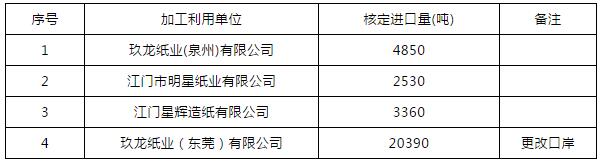 12月3日,環(huán)保部固體廢物與化學(xué)品管理技術(shù)中心公示了2019年第15批限制進(jìn)口類(lèi)產(chǎn)品明細(xì),共有4家造紙企業(yè)獲批,玖龍紙業(yè)(東莞)有限公司為更改口岸,新增核定量為10740噸,3家企業(yè)分別是玖龍紙業(yè)(泉州)有限公司、江門(mén)市明星紙業(yè)有限公司和江門(mén)星輝造紙有限公司。