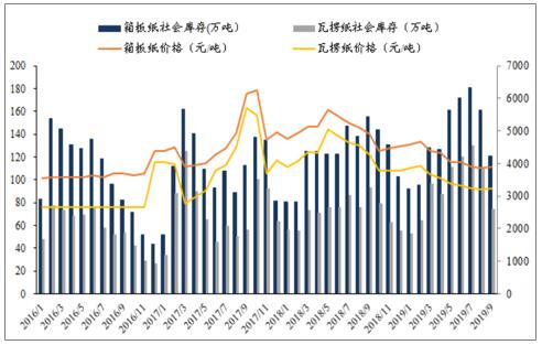 圖表來源:東吳證券研究所 箱板瓦楞2019年產(chǎn)銷量轉(zhuǎn)好。板瓦楞的生產(chǎn)量在2018年度首次出現(xiàn)負(fù)增長,其中箱板紙的表觀生產(chǎn)量2145萬噸(-10.06%)、瓦楞紙的表觀生產(chǎn)量2105萬噸(-9.85%),但自19Q1以來同比數(shù)據(jù)已經(jīng)逐季出現(xiàn)轉(zhuǎn)好,尤其2019Q3以來出貨量回升,說明下游需求出現(xiàn)企穩(wěn)。 箱板瓦楞紙生產(chǎn)量及表觀消費