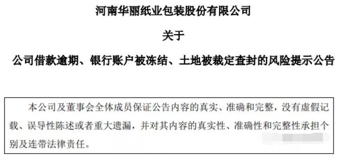 自2016年以來持續虧損,河南華麗紙業包裝股份有限公司(下稱:華麗包裝)正遭遇一系列危機:流動資金匱乏、銀行貸款逾期、銀行賬戶被凍結、土地相繼被法院裁定查封、公司及公司實際控制人被列入失信被執行人…… 由于難以在短時間內改善困難狀況,1月10日,華麗包裝發布公告稱,決定在現有尾單根據資金配置情況生產完畢后實施停產,待外部資金及業務合作能夠取得實質性進展后,再適時恢復生產。