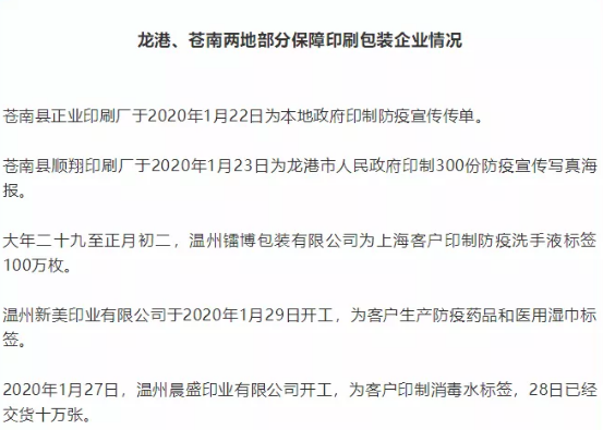 (圖來源于蒼南印刷包裝協(xié)會) 加班加點(diǎn),魯信天一加急生產(chǎn)醫(yī)用包裝盒 針對當(dāng)前疫情,國內(nèi)相關(guān)醫(yī)藥企業(yè)緊急調(diào)整生產(chǎn)計(jì)劃,加大有關(guān)產(chǎn)品產(chǎn)量,部分藥廠包裝盒庫存告急。據(jù)“齊魯網(wǎng)閃電新聞”消息,作為國內(nèi)藥品包裝印刷行業(yè)的領(lǐng)軍企業(yè),1月20日以來,山東魯信天一印務(wù)有限公司陸續(xù)接到近5500萬只包裝盒的加急訂單。 魯信天一第一時(shí)間召開緊急會議,調(diào)整春節(jié)放假計(jì)劃,啟動(dòng)節(jié)假日應(yīng)急預(yù)案,調(diào)動(dòng)各種資源,整合6條生產(chǎn)線全部投入生產(chǎn)。魯信天一領(lǐng)導(dǎo)班子帶頭,管理人員全力支援生產(chǎn),一線員工主動(dòng)調(diào)整個(gè)人休假,近300名員工分成白班夜班滿負(fù)荷生產(chǎn),截至23日晚夜班結(jié)束,共生產(chǎn)包裝盒2000多萬只。 按質(zhì)按量,75萬份宣傳資料一天完成 1月28日,山西省臨汾日報(bào)印刷廠接到市衛(wèi)健委緊急任務(wù),要求趕印一批防疫宣傳資料。據(jù)“臨汾新聞網(wǎng)”報(bào)道,接到任務(wù)后,臨汾日報(bào)印刷廠高度重視,迅速召回正在休假的工人師傅,接到指令的各崗位人員嚴(yán)陣以待確保第一時(shí)間投入生產(chǎn),全力支持打贏這場阻擊戰(zhàn)。 當(dāng)日晚10時(shí),工人們從制版、消毒、印刷,到抽頁、裁剪、打包……一切都在緊張有序地進(jìn)行著。時(shí)間緊、任務(wù)重,印刷廠干部、員工放棄休假,開足馬力連夜奮戰(zhàn),經(jīng)過數(shù)小時(shí)的努力,散發(fā)著油墨香的宣傳冊全部印刷完畢。