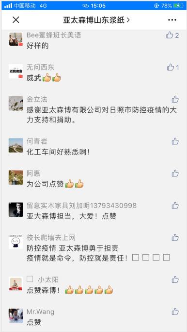 在灌裝現(xiàn)場(chǎng),最忙碌的就是公司安委會(huì)執(zhí)行主任范豐濤了。“我這幾天平均每天要接打200多個(gè)電話,基本都是關(guān)于次氯酸鈉。”如何申請(qǐng)、去哪里開介紹信、使用時(shí)注意什么……范豐濤一遍遍向他們說明。而為了防疫安全,他甚至一上午既顧不上、也不方便喝一口水。 線上、線下,你夸、他夸。亞太森博被日照市民齊聲贊揚(yáng)。 濤雒鎮(zhèn)衛(wèi)生院工作人員喬衛(wèi)東表示,亞太森博無償捐助次氯酸鈉消毒液惠及千家萬戶,市民非常感謝企業(yè)善舉,為亞太森博點(diǎn)贊。公司微信公眾號(hào)上的留言如雪片飛來,“良心企業(yè)”“大愛森博”!大家紛紛轉(zhuǎn)發(fā)、留言。