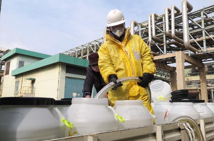 接到命令后,相關(guān)部門立即行動(dòng)起來。化學(xué)品車間經(jīng)理?xiàng)钪怯铝⒓唇M織各生產(chǎn)班組、生產(chǎn)工程師、維修人員、安全管理人員召開會(huì)議,傳達(dá)公司決定,安排生產(chǎn)計(jì)劃。“為保證現(xiàn)有生產(chǎn)安全穩(wěn)定運(yùn)行,車間員工主動(dòng)放棄休假,在自身做好防護(hù)措施的前提下輪流上陣,24小時(shí)不停歇加班加點(diǎn)調(diào)配生產(chǎn)。疫情就是命令,防控就是責(zé)任,大疫面前,舍小家,顧大家!”楊智勇表示。化學(xué)品車間每天要抽調(diào)多名員工輪流值班,在料峭寒風(fēng)的中灌裝次氯酸鈉消毒液。