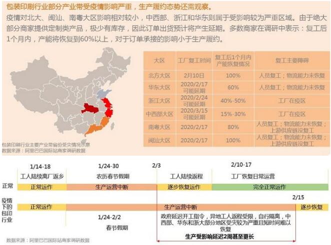 原紙漲價潮的興起,對包裝印刷企業的經營造成較大風險。而就在前不久,阿里巴巴國際站也發布了包裝印刷行業疫情期特刊,指出行業在未來三個月將存在多個風險點。這似乎意味著,近幾個月內,包裝印刷企業將面臨著嚴重的生存危機。 疫情下,行業受影響程度判斷 疫情對供應鏈的最直接的影響:工廠停工及生產復工延期,就包裝印刷出口而言,短期存在波動,但整體影響有限。 對內:受到口罩、消毒液、藥品及醫療器械等健康醫療的需求增加,對應的包裝產品需求也出現爆炸式的增加,部分工廠被政府征調,進行定向生產供應,造成部分已接的外貿訂單需延期發貨。同時,因為疫情的隔離,需要線上購物包括生活用品、冷凍食品、生鮮食品的訂單增加,對應的食品機乳制品的包裝內貿市場也在提升,并且將長期保持穩定增長。 因為受到疫情影響,原本春節熱銷的禮品、服裝及煙酒銷售受到巨大沖擊,尤其對煙酒行業的影響預計將持續一年,煙酒行業受到此次疫情造成大量庫存積壓,預計一年內相關的煙酒行業包裝將持續低迷。3C包裝受延遲復工影響,企業部分收入可能延后確認,但行業不改景氣向上,全年訂單預期不變。 對外:預計疫情有效控制后可快速回復出口。賣家訂單多在年前已下達,主要履約障礙在于復工延遲、物流配送放緩、疫情發展的不確定性,以及各國對檢驗檢疫要求的提升。目前發現,有小部分印包需求向臺灣轉移的趨勢。