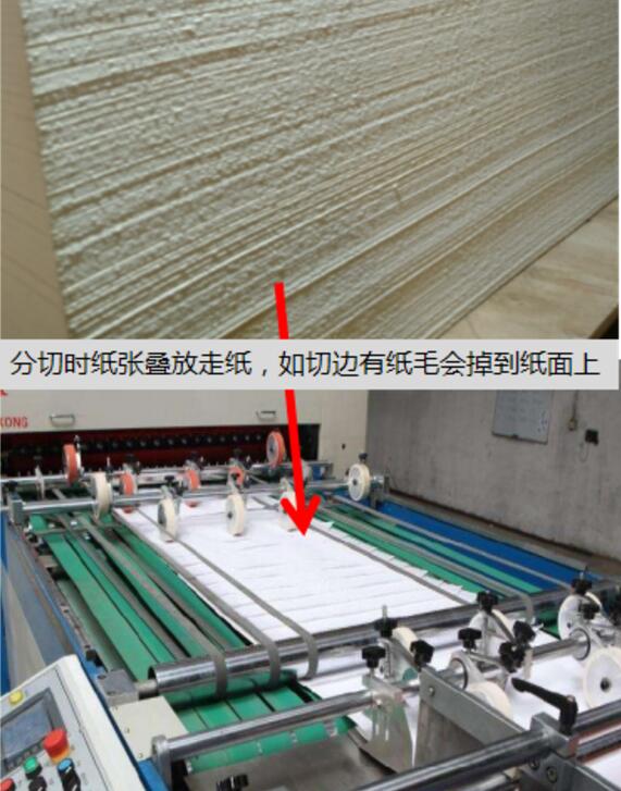 圖3:借助電筒光查看紙張端面分切品質 特別需要注意的是,紙張在分切過程中是重疊走紙,如切邊紙毛紙屑多,在分切過程中就會把紙毛帶入到紙面,后續再修邊也無濟于事。