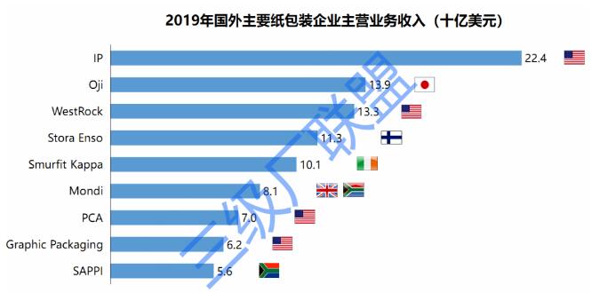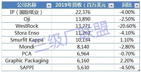 排名第一的仍然是美國的紙包裝行業領袖國際紙業(IP),年營收224億美元。王子造紙(Oji)、WestRock、Stora Enso分別位列第二、三、四位,2019年營收分別達到139億美元、133億美元、113億美元。
