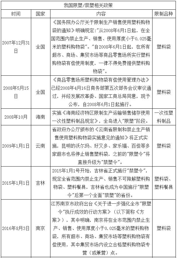 截止發(fā)稿,我國(guó)對(duì)塑料食品包裝暫未推出全國(guó)性政策,但地方政府、外賣(mài)平臺(tái)已開(kāi)始對(duì)塑料餐具的使用進(jìn)行限制及引導(dǎo)。隨著外賣(mài)行業(yè)快速發(fā)展激化塑料污染問(wèn)題,推出全國(guó)性限塑政策將是大勢(shì)所趨。2012年起,我國(guó)外賣(mài)行業(yè)發(fā)展迅速,2017年餐飲外賣(mài)市場(chǎng)規(guī)模約2430億元,規(guī)模以上快遞業(yè)務(wù)收入4957億元,2012-2017年外賣(mài)及快遞行業(yè)復(fù)合增速分別達(dá)到43.7%/36.3%。外賣(mài)行業(yè)使用的塑料餐盒及快遞行業(yè)使用的塑料包裝袋加劇了塑料廢棄物污染,外賣(mài)“白色污染”受到媒體和環(huán)保人士的廣泛關(guān)注。2017年9月,外賣(mài)龍頭餓了么發(fā)布“藍(lán)色星球”計(jì)劃,美團(tuán)啟動(dòng)“青山計(jì)劃”以提高商家使用環(huán)保餐具積極性;海南省自今年起分種類(lèi)逐步推進(jìn)全面禁塑,2020年底前,全省禁止生產(chǎn)、銷(xiāo)售和使用一次性不可降解塑料制品。