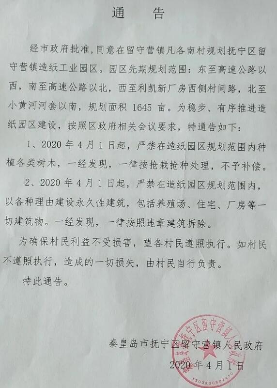 通告中,可以看到多年整合造紙行業的計劃終于進入了實質性階段。造紙園區的選址在留守營鎮凡各南村的東南位置,這也是撫寧區委區政府結合行業現狀、多次實地踏查、研討、規劃而確定。