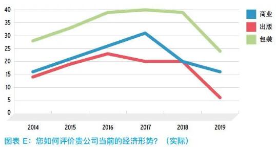 雖然從圖表 D 中可以看出,供應商在 2017 年確實有些過度興奮,但近年來,他們在預測時已經更為現實,也就是說,他們不會過于樂觀或悲觀。然而,值得注意的是,有許多印刷商和供應商的全球經濟實際信心報告與去年同期非常接近。其模式很明顯。首先,可以看出,在經受 2007 年和 2008 年全球經濟衰退以及數字媒體影響的雙重沖擊之后,人們對經濟的信心正在緩慢但穩定地復蘇。但是從 2017 年開始,對經濟的預期不斷下降,主要是因為人們對政治不穩定、全球貿易戰爭等更廣泛的社會經濟問題愈發關注。此外,即使預期的恢復速度可能相對較快,冠狀病毒疫情的爆發也無疑是加重了這次經濟放緩。 各市場全球經濟的信心隨時間的變化 樂觀與悲觀百分比凈差值