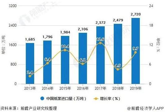 2013-2019年中國(guó)紙漿進(jìn)口金額統(tǒng)計(jì)及增長(zhǎng)情況