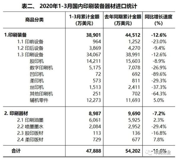 國(guó)內(nèi)印刷裝備、器材進(jìn)口概況 2020年1月—3月,國(guó)內(nèi)印刷裝備進(jìn)口3.89億美元,與去年同期相比,下降12.6%。其中,印前設(shè)備進(jìn)口964萬(wàn)美元,同比下降23.0%;印刷設(shè)備進(jìn)口3.41億美元,同比下降12.6%;印后設(shè)備進(jìn)口3869萬(wàn)美元,同比下降9.4%。 從印刷設(shè)備子項(xiàng)的進(jìn)口數(shù)據(jù)看,膠印機(jī)進(jìn)口1.42億美元,同比下降8.9%;數(shù)字印刷機(jī)進(jìn)口5175萬(wàn)美元,同比下降26.9%;凹印機(jī)進(jìn)口72萬(wàn)美元,同比下降89.6%;柔印機(jī)進(jìn)口573萬(wàn)美元,同比下降29.3%;絲印機(jī)進(jìn)口1513萬(wàn)美元,同比下降37.3%;其他印刷機(jī)進(jìn)口251萬(wàn)美元,同比下降64.3%;輔機(jī)零件進(jìn)口1.23億美元,同比增長(zhǎng)5.0%。 2020年1月—3月,國(guó)內(nèi)印刷器材進(jìn)口8987萬(wàn)美元,同比下降7.2%。其中,印刷油墨進(jìn)口2554噸,6061萬(wàn)美元(同比增長(zhǎng)2.3%);噴墨墨水進(jìn)口1112噸,2084萬(wàn)美元(同比下降29.4%);膠印版材進(jìn)口4.60萬(wàn)平方米,113萬(wàn)美元(同比下降16.8%);柔印版材進(jìn)口12.40萬(wàn)平方米,729萬(wàn)美元(同比增長(zhǎng)7.8%)。