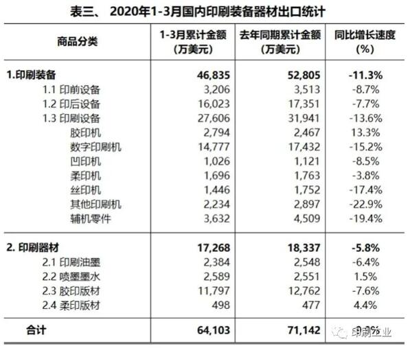 國(guó)內(nèi)印刷裝備、器材出口概況 2020年1月—3月,國(guó)內(nèi)印刷裝備出口4.68億美元,與去年同期相比,下降11.3%。其中,印前設(shè)備出口3206萬(wàn)美元,同比下降8.7%;印刷設(shè)備出口2.76億美元,同比下降13.6%;印后設(shè)備出口1.60億美元,同比下降7.7%。 從印刷設(shè)備子項(xiàng)的出口數(shù)據(jù)看,膠印機(jī)出口2794萬(wàn)美元,同比增長(zhǎng)13.3%;數(shù)字印刷機(jī)出口1.48億美元,同比下降15.2%;凹印機(jī)出口1026萬(wàn)美元,同比下降8.5%;柔印機(jī)出口1696萬(wàn)美元,同比下降3.8%;絲印機(jī)出口1446萬(wàn)美元,同比下降17.4%;其他印刷機(jī)出口2234萬(wàn)美元,同比下降22.9%;輔機(jī)零件出口3632萬(wàn)美元,同比下降19.4%。 2020年1月—3月,國(guó)內(nèi)印刷器材出口1.73億美元,同比下降5.8%。其中,印刷油墨出口5972噸,2384萬(wàn)美元(同比下降6.4%);噴墨墨水出口3728噸,2589萬(wàn)美元(同比增長(zhǎng)1.5%);膠印版材出口4690萬(wàn)平方米,1.18億美元(同比下降7.6%);柔印版材出口12萬(wàn)平方米,498萬(wàn)美元(同比增長(zhǎng)4.4%)。