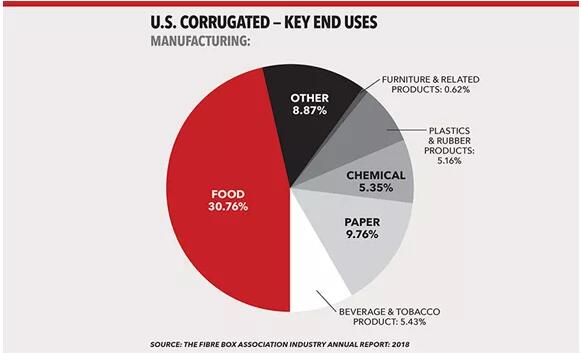 備注:美國地區(qū)的瓦楞包裝最終用途顯示:食品占比30.76%,飲料與煙草占比5.43%,紙業(yè)占比9.76%,化學(xué)占比5.35%,塑料與橡膠制品占比5.16%,家具與相關(guān)產(chǎn)品占比0.62%,其他領(lǐng)域則占比8.87%。 瓦楞紙箱一旦使用,可以不止一次的被回收再利用。2018年,美國回收了所有瓦楞包裝的96%,平均而言,瓦楞紙箱包含50%的回收成分。該記錄使瓦楞紙業(yè)領(lǐng)先于其他包裝材料的回收和再利用率。紙箱經(jīng)過重新制造,在整個(gè)行業(yè)中一次又一次地使用纖維制造新紙箱。 此外,從造紙和印刷技術(shù)到可持續(xù)的制造和回收工藝的技術(shù)進(jìn)步,再加上瓦楞工業(yè)中人們的創(chuàng)新精神,將繼續(xù)推動(dòng)瓦楞工業(yè)向前發(fā)展。瓦楞包裝行業(yè)進(jìn)行創(chuàng)新并提供解決方案以應(yīng)對(duì)新包裝挑戰(zhàn)的機(jī)會(huì)無窮無盡。 對(duì)全球的瓦楞包裝市場(chǎng)而言,很明顯,2020年對(duì)于瓦楞包裝行業(yè)將是非凡機(jī)遇的一年。