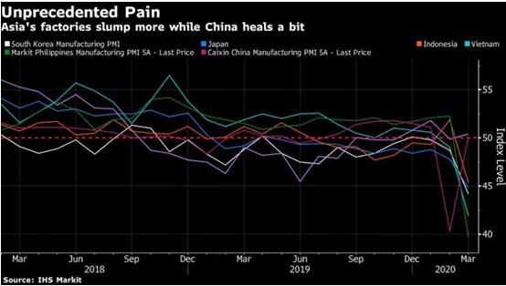 亞洲多個經(jīng)濟體的工廠產(chǎn)出指標在4月跌至紀錄低點,這表明即使中國開始重啟生產(chǎn)活動,世界制造業(yè)樞紐的收縮程度仍在加深。IHS Markit周一發(fā)布的數(shù)據(jù)顯示,東南亞很多國家的采購經(jīng)理人指數(shù)(PMI)在50這一榮枯分水嶺下方進一步下滑,創(chuàng)下相關指數(shù)有史以來的最低水平。日本和韓國的指數(shù)降至2009年以來的最低水平。