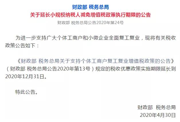 國家稅務(wù)總局發(fā)布,為進(jìn)一步支持廣大個體工商戶和小微企業(yè)全面復(fù)工復(fù)業(yè),《財政部 稅務(wù)總局關(guān)于支持個體工商戶復(fù)工復(fù)業(yè)增值稅政策的公告》(財政部 稅務(wù)總局公告2020年第13號)規(guī)定的稅收優(yōu)惠政策實施期限延長到2020年12月31日。
